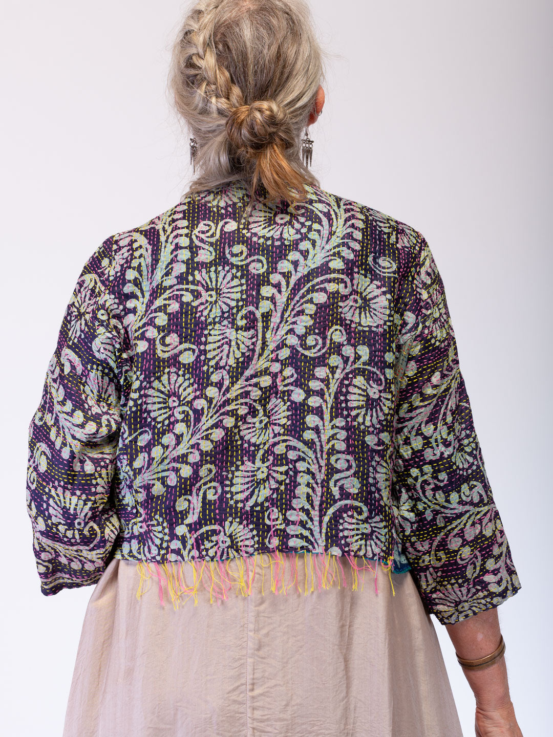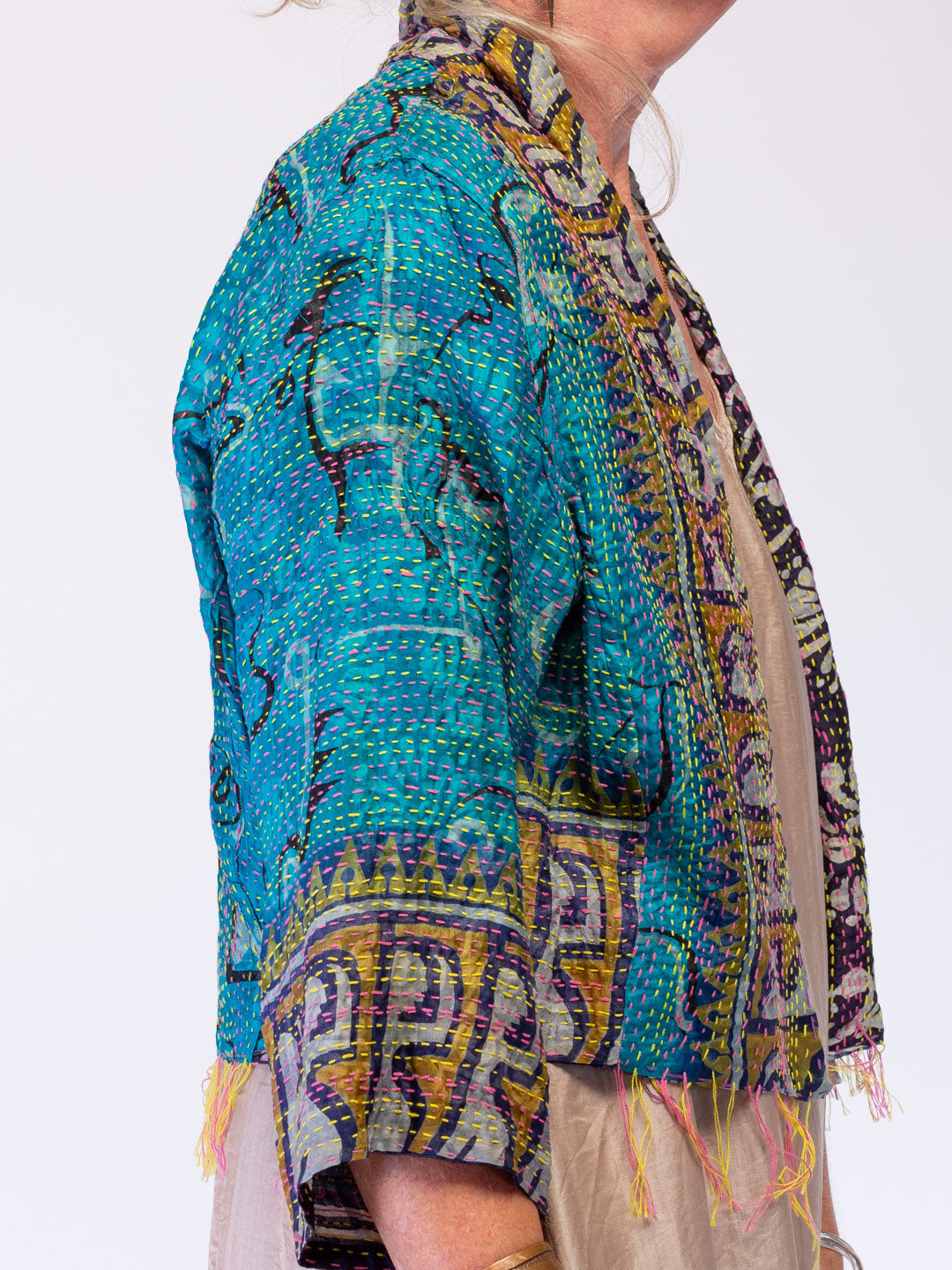 Reversible hand stitched boho silk jacket. Cropped with fringing, 3/4 sleeve & patch pockets. 2-in-1 repurposed from silk sari's.This beautiful lightweight jacket gives you twice the options. Turn up the cuffs to reveal the underside's colours and patterns.