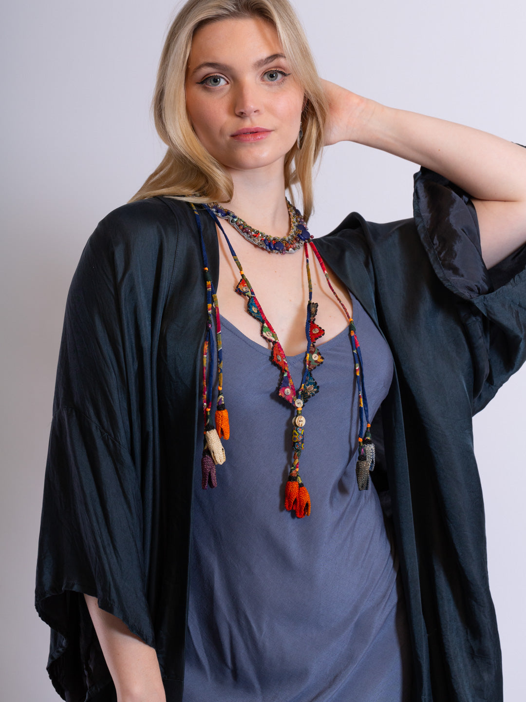Individually handsewn "flags" (each with small seed beads) on , and then adorned with tiny shell buttons.