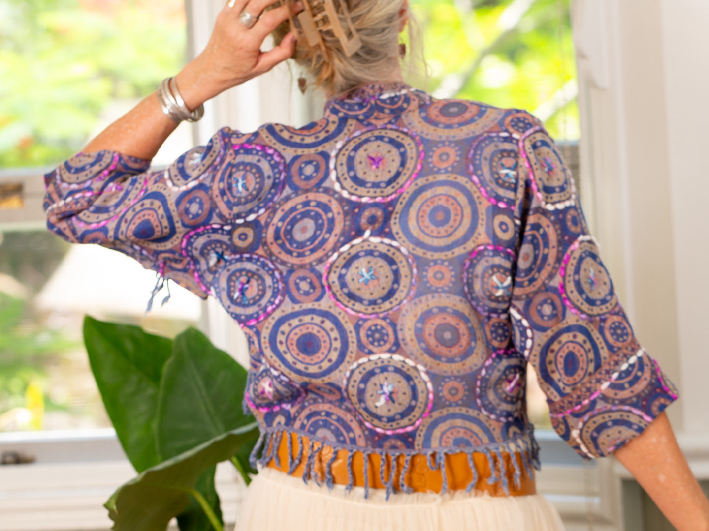 Kashmiri soft fringed wool jacket. No two garments are alike with their unique designs and hand stitched embroidery detail. Each come with a fringed sleeve and front pocket. Fringed hem gives this a glamorous boho appeal.