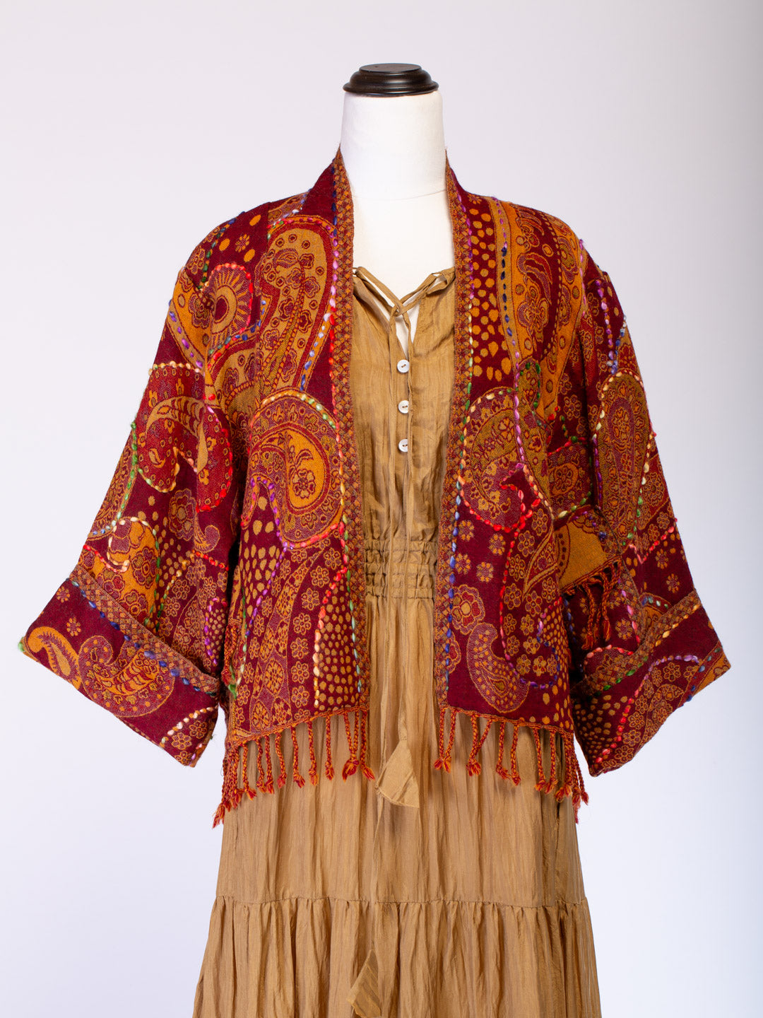 Kashmiri soft fringed wool jacket. No two garments are alike with their unique designs and hand stitched embroidery detail. Each come with a fringed sleeve and front pocket. Fringed hem gives this a glamorous boho appeal.