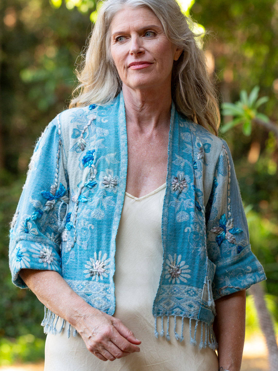 Kashmiri soft fringed wool jacket. No two garments are alike with their unique designs and hand stitched embroidery detail. Each come with a fringed sleeve and front pocket. Fringed hem gives this a glamorous boho appeal.