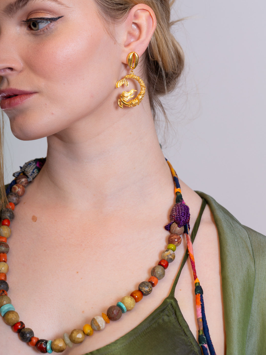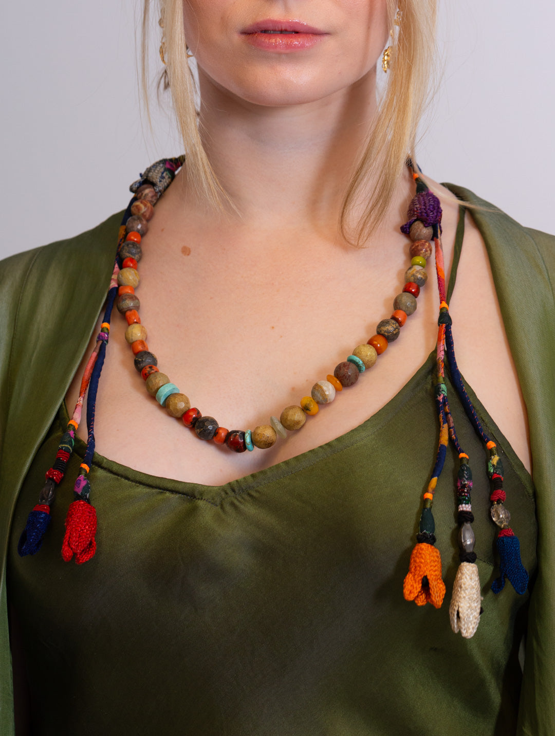 A mixture of rustic semi-precious beads with fabric cords vintage decorations and  tasselled silk tulips.