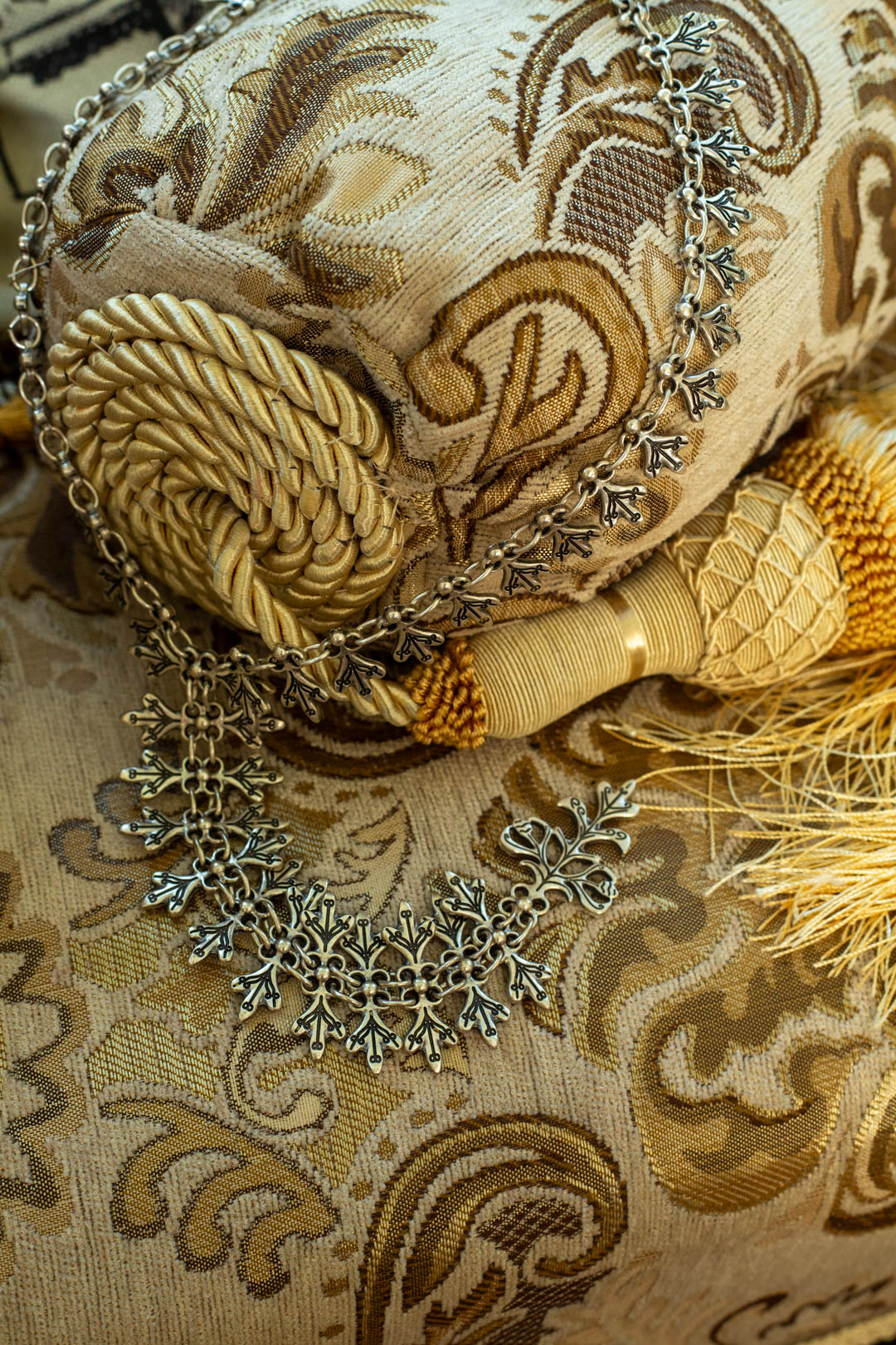 Poison Ivy Tie Necklace - Silver trifoliate leaf motifs on a long tie necklace completed with and ornate pendant.