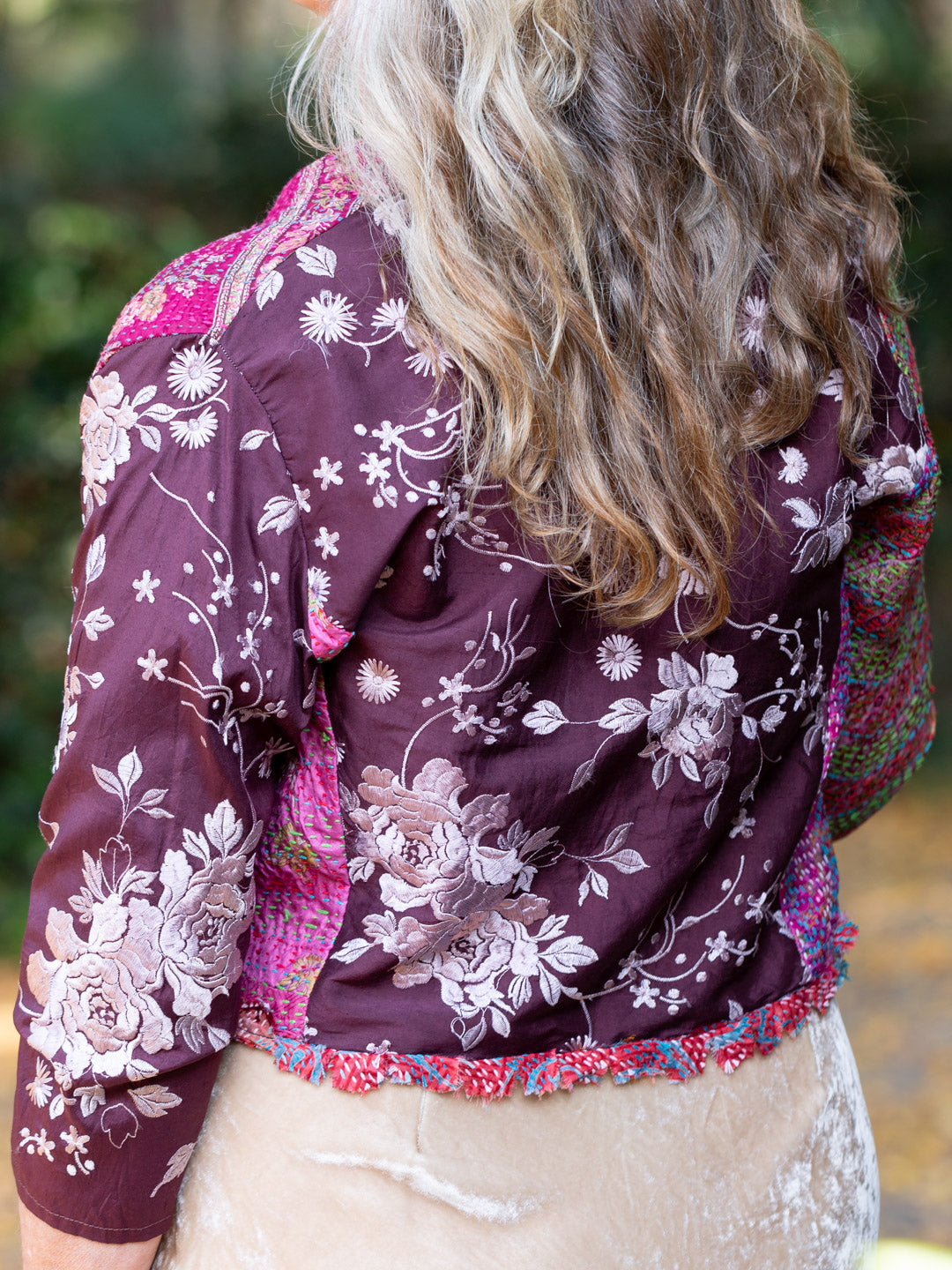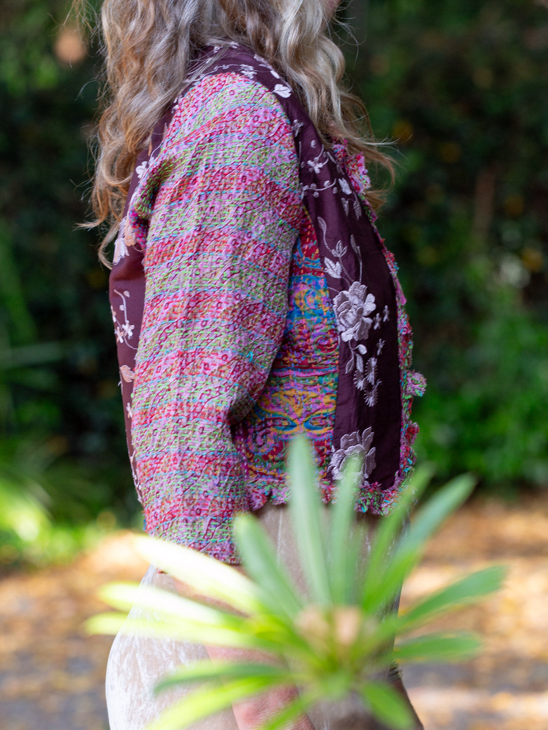 Kantha hand stitched silk with gorgeous dupion combine to make these crop bolero with fringing.